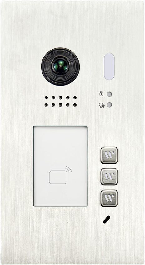 Die Außenstation ist aus robustem, gebürstetem Edelstahl gefertigt und wird bündig in die Fassade integriert. Sie verfügt über eine hochauflösende 2-Megapixel-Starlight-Kamera mit einem extrem weiten Blickwinkel von 170°, sodass Besucher auch bei schlechten Lichtverhältnissen klar erkannt werden können. Zusätzlich ist ein RFID-Zugang integriert, über den bis zu 320 Nutzer komfortabel und sicher das Gebäude betreten können. Drei beleuchtete Klingeltaster sorgen für eine klare Zuordnung der Wohneinheiten.