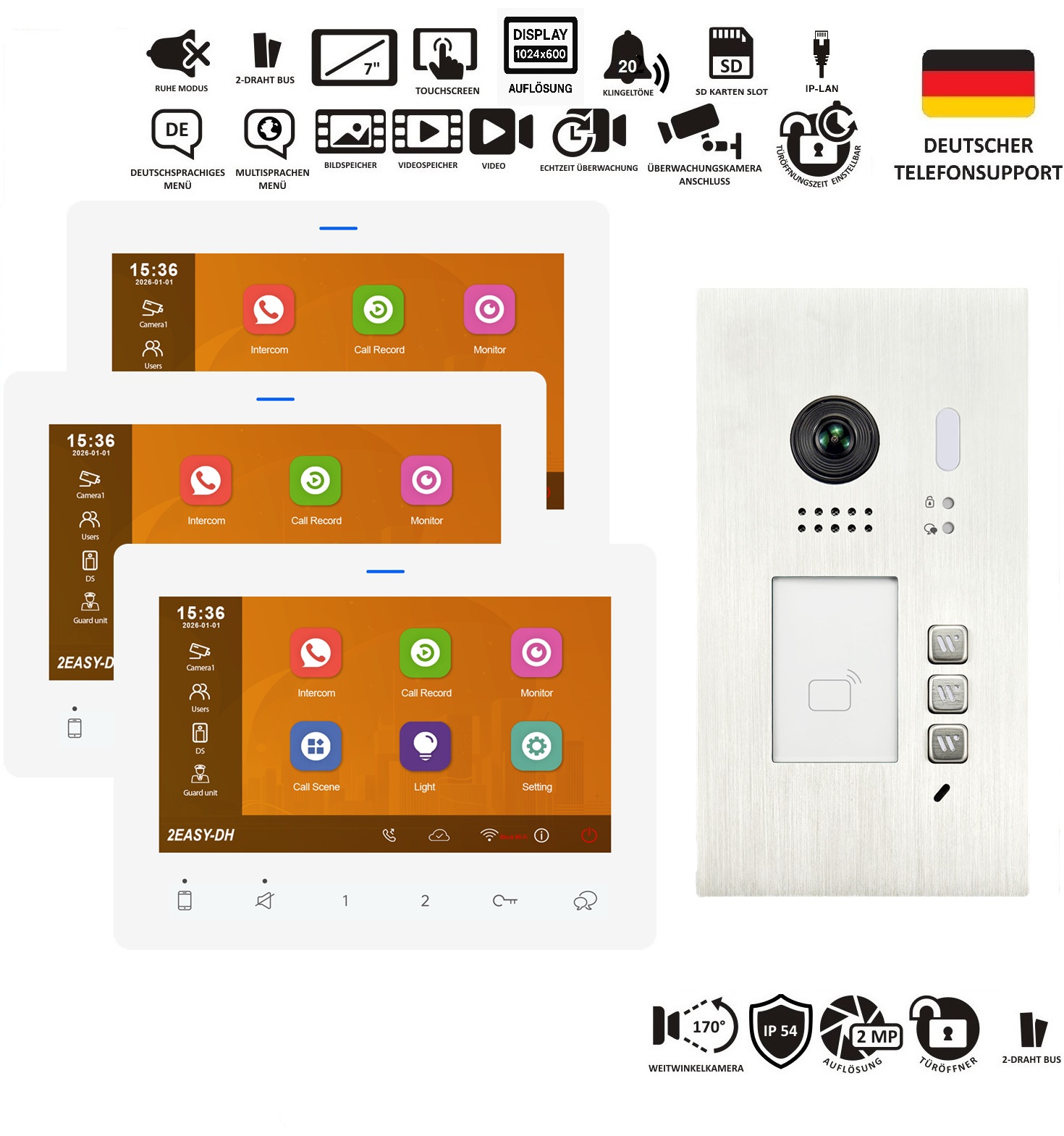- Einstellmöglichkeiten: Kontrast, Helligkeit, Gesprächslautstärke, Klingelton, Weiterletung auf's Smartphone, IP Kameras ect.