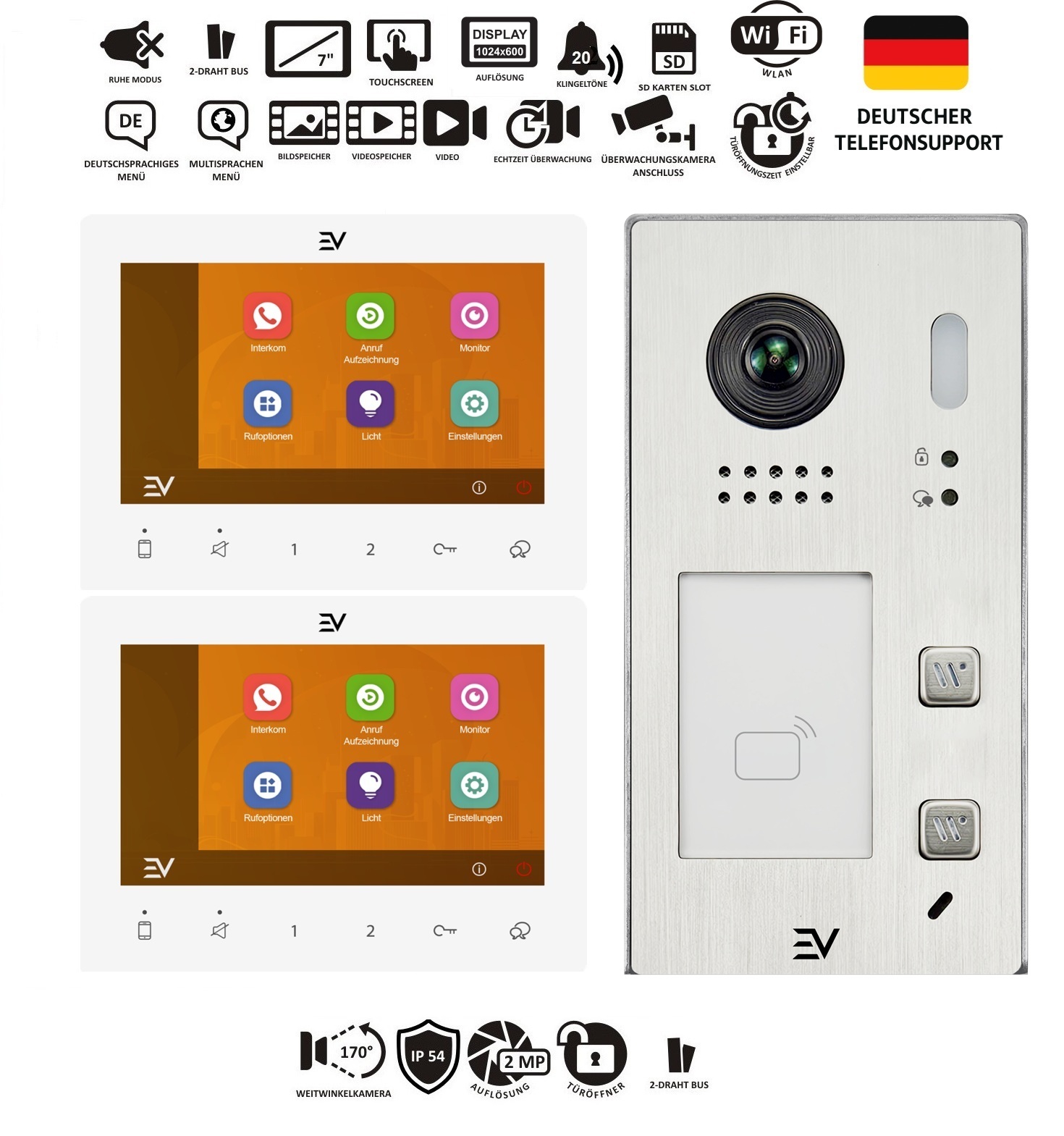 Videosprechanlagen Komplettsystem für moderne ZweifamilienhäuserDieses Set bietet Ihnen alles, was Sie für eine vernetzte und sichere Türkommunikation im Zweifamilienhaus benötigen: Die robuste EV622-S2 Außenstation mit 2 Klingeltasten (Aufputz), zwei EV-7G-WS Touchmonitore in Weiß und den zuverlässigen PC9 Hutschienentrafo.