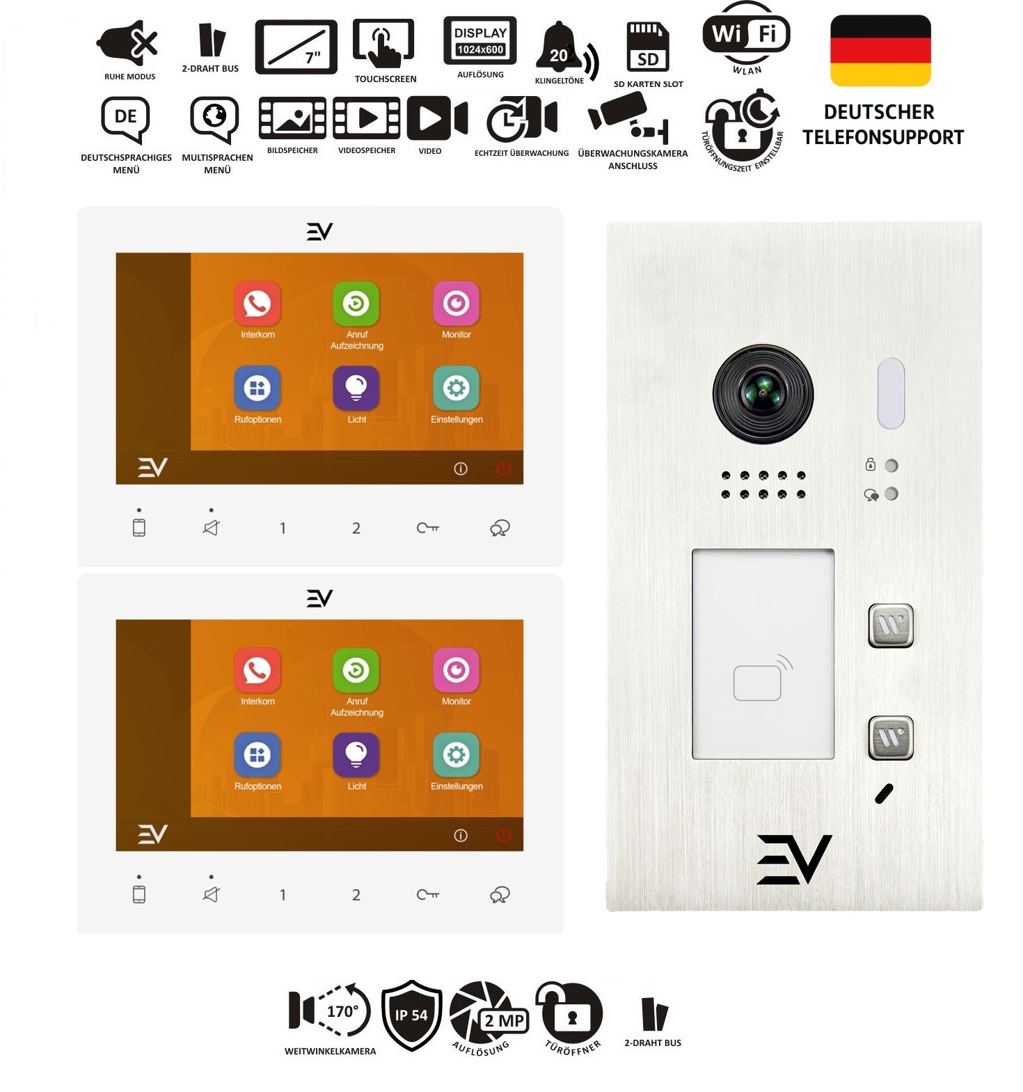 Professionelles Videotürsprechanlagen Komplettset für Ihr 2 FamilienhausDieses Set bietet alles für eine moderne und sichere Türkommunikation: die EV622F-S2 Außenstation mit 2 Klingeltasten zur Unterputzmontage, zwei EV-7G-WS Innenmonitore mit Touchscreen und WLAN sowie der leistungsstarke PC9 Trafo zur Stromversorgung des gesamten Systems.
